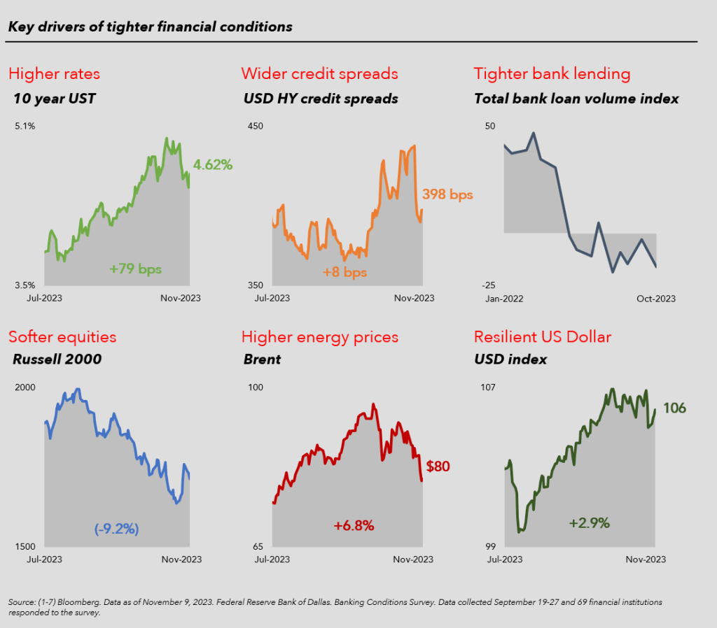 This chart, courtesy of Tom Joyce’s team at MUFG Capital, shows that financial conditions have indeed become tighter since the summer.